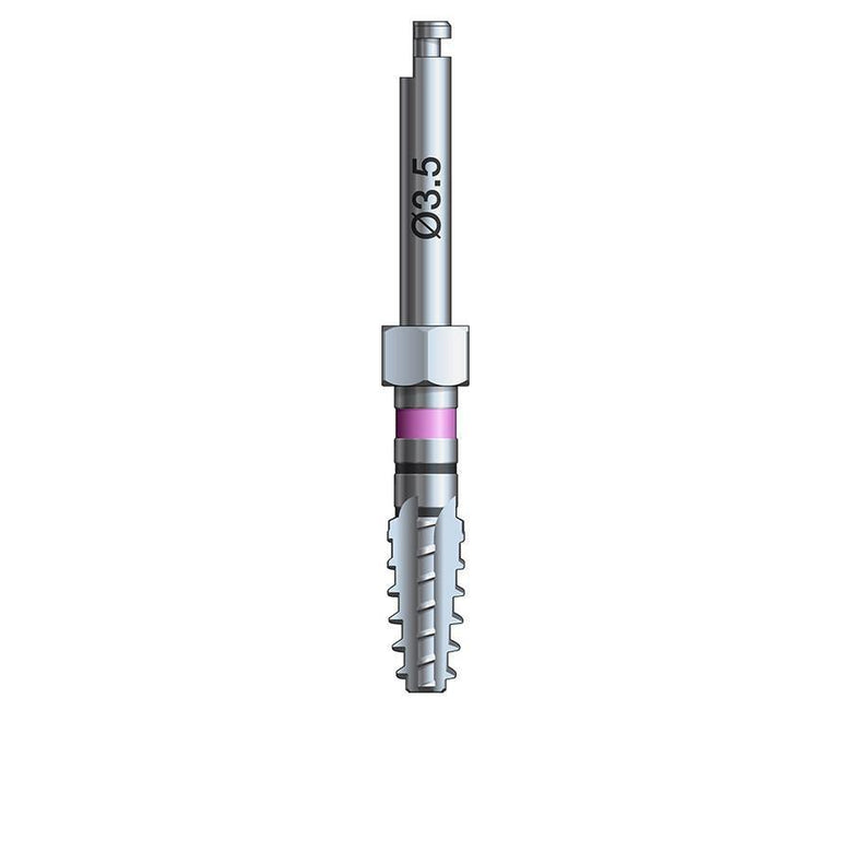 For the placement of Glidewell HT Implants in extremely dense bone, it may be necessary to utilize a thread-forming screw tap corresponding to the diameter of the implant body. Due to the tap design and implant cutting efficiency, one tap is used for multiple implant lengths. The coronal head of each screw tap is slightly flared, resulting in a gentle expansion of the cortical plate for receiving the wider neck of the implant.