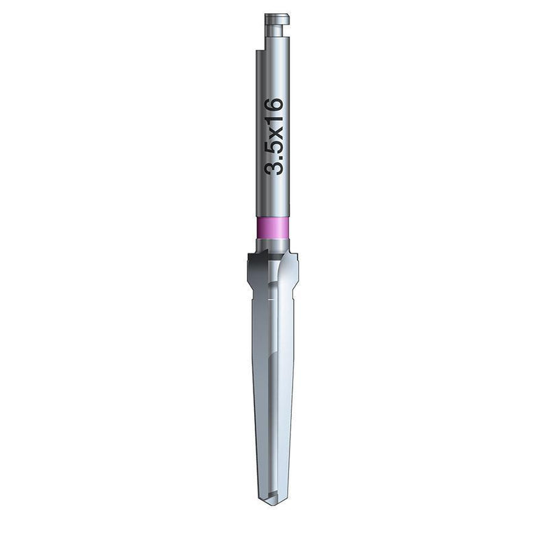 If placing a Glidewell HT Implant that is 3.5 mm in diameter or greater, Shaping Drills are used sequentially to widen the osteotomy to the matching diameter. To avoid over-preparation, widening drill diameters should be used only as needed, and in proper succession. Each Shaping Drill is length-specific, to match the length of the prescribed implant. Osteotomy depth may be increased sequentially, beginning with shorter drill lengths, provided sufficient depth is achieved with the final drill. Select the desired Shaping Drill, accounting for bone density and the size of the implant to be placed. With copious irrigation, drill to depth. The final drill should correspond with the matching implant size with the goal of achieving high primary stability upon implant placement.