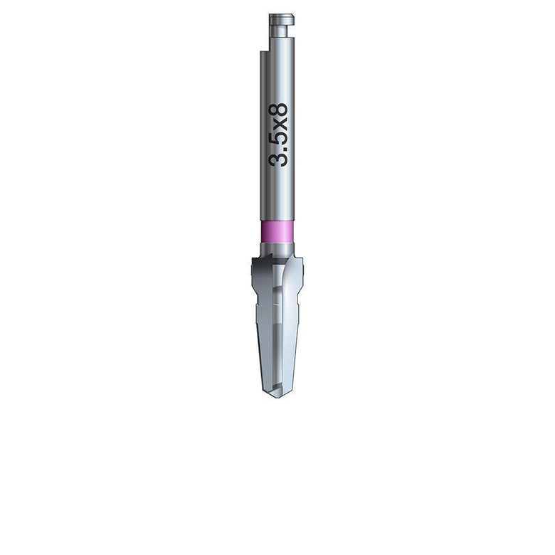 If placing a Glidewell HT Implant that is 3.5 mm in diameter or greater, Shaping Drills are used sequentially to widen the osteotomy to the matching diameter. To avoid over-preparation, widening drill diameters should be used only as needed, and in proper succession. Each Shaping Drill is length-specific, to match the length of the prescribed implant. Osteotomy depth may be increased sequentially, beginning with shorter drill lengths, provided sufficient depth is achieved with the final drill. Select the desired Shaping Drill, accounting for bone density and the size of the implant to be placed. With copious irrigation, drill to depth. The final drill should correspond with the matching implant size with the goal of achieving high primary stability upon implant placement.