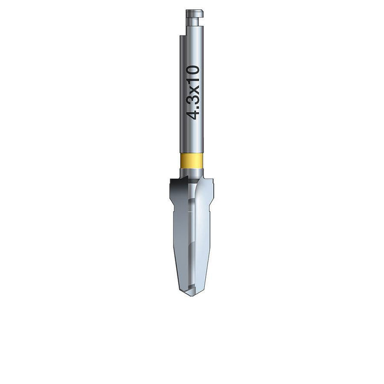 If placing a Glidewell HT™ Implant that is 3.5 mm in diameter or greater, Shaping Drills are used sequentially to widen the osteotomy to the matching diameter. To avoid over-preparation, widening drill diameters should be used only as needed, and in proper succession. Each Shaping Drill is length-specific, to match the length of the prescribed implant. Osteotomy depth may be increased sequentially, beginning with shorter drill lengths, provided sufficient depth is achieved with the final drill. Select the desired Shaping Drill, accounting for bone density and the size of the implant to be placed. With copious irrigation, drill to depth. The final drill should correspond with the matching implant size with the goal of achieving high primary stability upon implant placement.