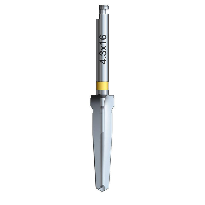 If placing a Glidewell HT Implant that is 3.5 mm in diameter or greater, Shaping Drills are used sequentially to widen the osteotomy to the matching diameter. To avoid over-preparation, widening drill diameters should be used only as needed, and in proper succession. Each Shaping Drill is length-specific, to match the length of the prescribed implant. Osteotomy depth may be increased sequentially, beginning with shorter drill lengths, provided sufficient depth is achieved with the final drill. Select the desired Shaping Drill, accounting for bone density and the size of the implant to be placed. With copious irrigation, drill to depth. The final drill should correspond with the matching implant size with the goal of achieving high primary stability upon implant placement.