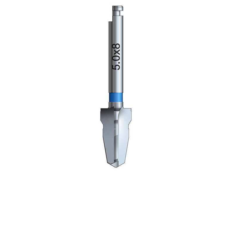 If placing a Glidewell HT Implant that is 3.5 mm in diameter or greater, Shaping Drills are used sequentially to widen the osteotomy to the matching diameter. To avoid over-preparation, widening drill diameters should be used only as needed, and in proper succession. Each Shaping Drill is length-specific, to match the length of the prescribed implant. Osteotomy depth may be increased sequentially, beginning with shorter drill lengths, provided sufficient depth is achieved with the final drill. Select the desired Shaping Drill, accounting for bone density and the size of the implant to be placed. With copious irrigation, drill to depth. The final drill should correspond with the matching implant size with the goal of achieving high primary stability upon implant placement.