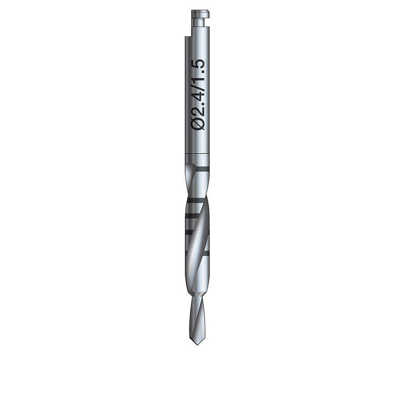Larger Twist Drills are stepped to accommodate the tapered design of the implant. The first two diameters (1.5 mm and 2.4/1.5 mm) are considered pilot drills. The largest diameter (2.8/2.4 mm) is available in five lengths (8 mm, 10 mm, 11.5 mm, 13 mm, 16 mm), corresponding to the available implant lengths. Drill length is calculated to indicate where the top of the implant will reside when fully seated to that depth.