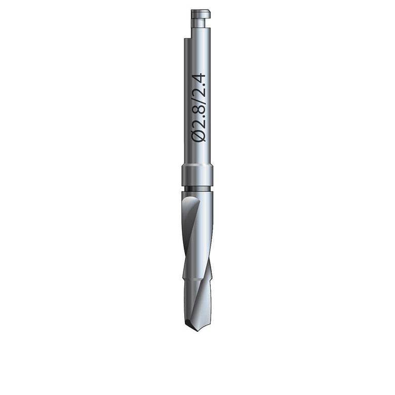 Larger Twist Drills are stepped to accommodate the tapered design of the implant. The first two diameters (1.5 mm and 2.4/1.5 mm) are considered pilot drills. The largest diameter (2.8/2.4 mm) is available in five lengths (8 mm, 10 mm, 11.5 mm, 13 mm, 16 mm), corresponding to the available implant lengths. Drill length is calculated to indicate where the top of the implant will reside when fully seated to that depth.