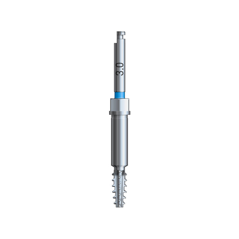 For the placement of Glidewell HT Implants in extremely dense bone, it may be necessary to utilize a thread-forming screw tap corresponding to the diameter of the implant body. Due to the tap design and implant cutting efficiency, one tap is used for multiple implant lengths. The coronal head of each screw tap is slightly flared, resulting in a gentle expansion of the cortical plate for receiving the wider neck of the implant.