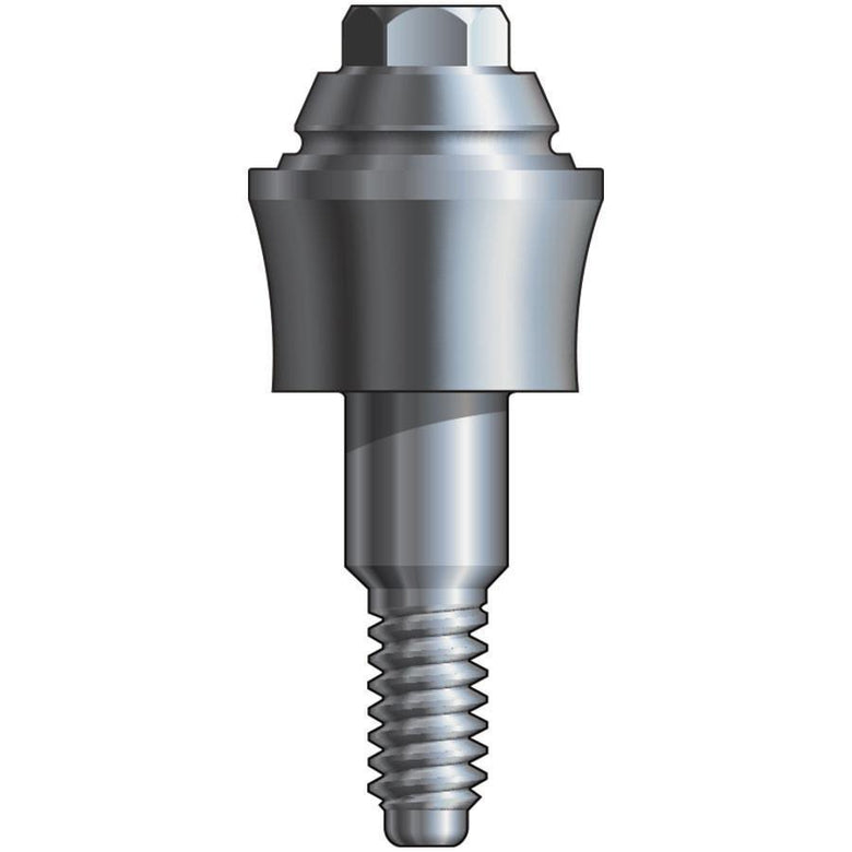Straight multi-unit abutments lack any anti-rotational features at the implant-abutment interface. The apical portion of a straight multi-unit abutment is threaded for attachment with the internal connection of a seated implant. For abutment delivery, the occlusal surface features a male hex head compatible with the Inclusive Multi-Unit Driver.