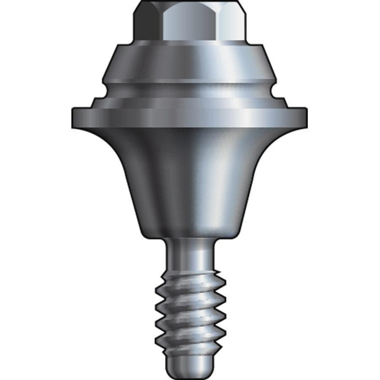 Straight multi-unit abutments lack any anti-rotational features at the implant-abutment interface. The apical portion of a straight multi-unit abutment is threaded for attachment with the internal connection of a seated implant. For abutment delivery, the occlusal surface features a male hex head compatible with the Inclusive Multi-Unit Driver.