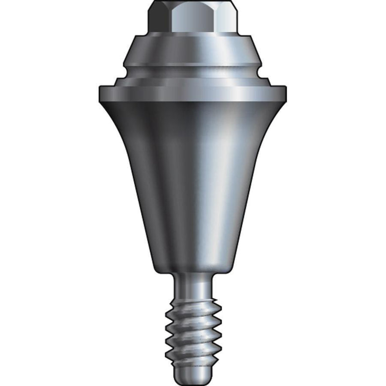 Straight multi-unit abutments lack any anti-rotational features at the implant-abutment interface. The apical portion of a straight multi-unit abutment is threaded for attachment with the internal connection of a seated implant. For abutment delivery, the occlusal surface features a male hex head compatible with the Inclusive Multi-Unit Driver.