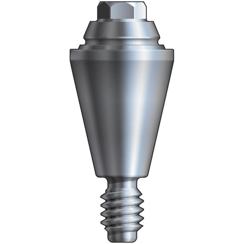 Straight multi-unit abutments lack any anti-rotational features at the implant-abutment interface. The apical portion of a straight multi-unit abutment is threaded for attachment with the internal connection of a seated implant. For abutment delivery, the occlusal surface features a male hex head compatible with the Inclusive Multi-Unit Driver.
