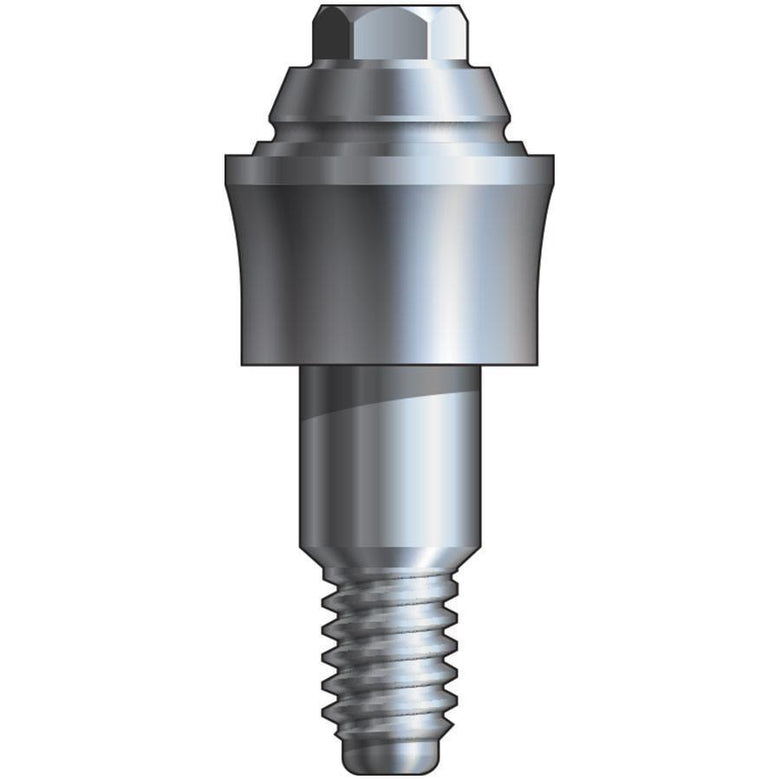Straight multi-unit abutments lack any anti-rotational features at the implant-abutment interface. The apical portion of a straight multi-unit abutment is threaded for attachment with the internal connection of a seated implant. For abutment delivery, the occlusal surface features a male hex head compatible with the Inclusive Multi-Unit Driver.