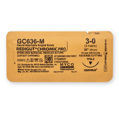 As a resorbable option, REDIGUT® PRO Sutures are available in both polyglycolic acid (PGA) and chromic for a reliable outcome. The sutures are broken down naturally over time, leaving no foreign body left behind. Containing 12 sutures in each box, REDIGUT PRO Sutures come packaged in a special gravity-fed dispenser that provides easy access to suture packets from an opening at the bottom of the box. Its pure foil pouch and medical-grade paper add another layer of protection that secures the integrity of the suture. Included in the REDIGUT PRO packaging is a 3/8 reverse-cutting needle that is specifically created for tough, difficult-to-penetrate tissue. There are several advantages of using a reverse-cutting needle: