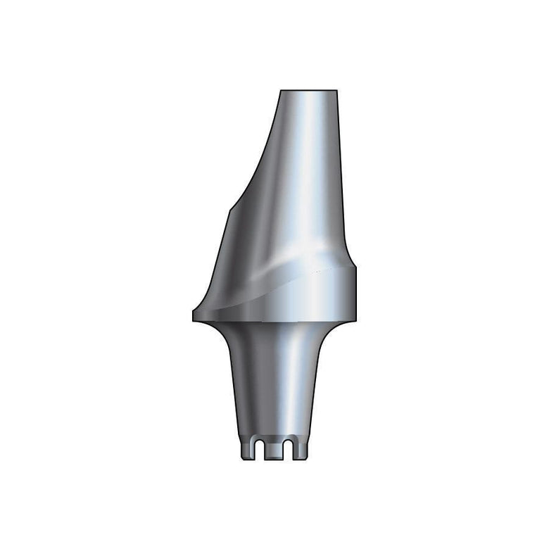 Inclusive Titanium Esthetic Abutments are prefabricated, screw-retained intraoral abutments intended to be connected directly to an endosseous implant for retention of a cemented dental prosthesis. They may be indicated for single- and multiple-tooth restorations. Titanium esthetic abutments are precisely machined from titanium alloy and packaged NON-STERILE. They are attached to the implant fixture with a titanium screw. Unlike the circular emergence profile of standard stock abutments, esthetic abutments are manufactured with a tapered emergence profile for more natural-looking contouring of the soft tissue at the implant site. Each esthetic abutment is specific to the restorative platform of the seated implant, and anatomically designed for the connection site’s region on the ridge (anterior or posterior). In addition to the standard, straight abutment body, angled abutment bodies, produced with a 15 degree slope of one hemisphere to compensate for an undesirable path of insertion resulting from excessive implant angulation, are available.