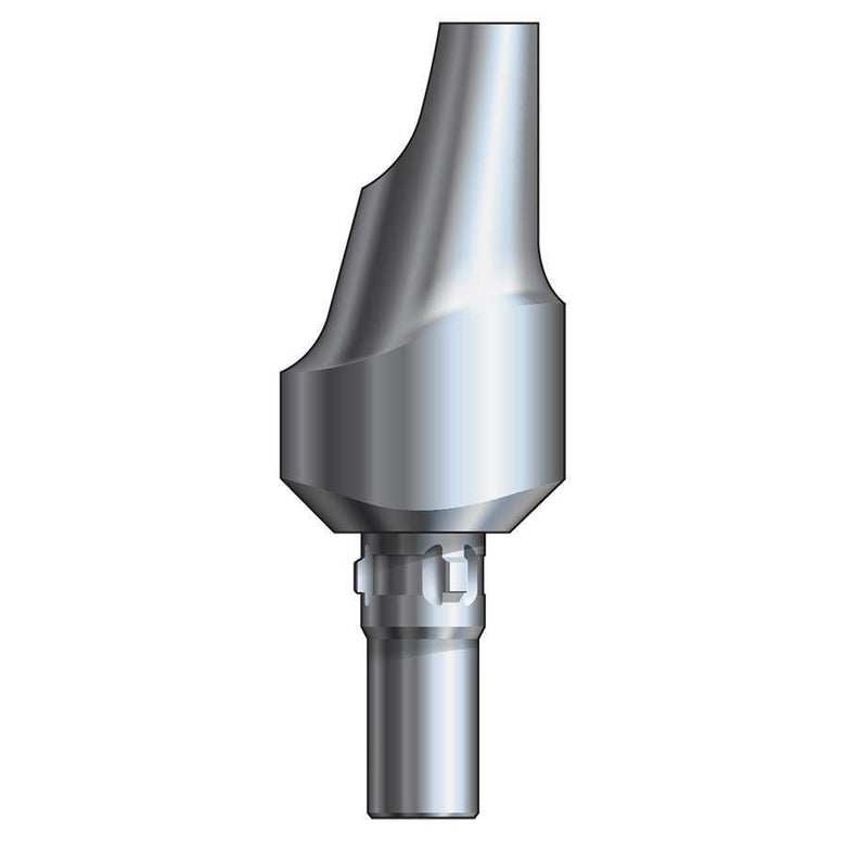 Inclusive Titanium Esthetic Abutments are prefabricated, screw-retained intraoral abutments intended to be connected directly to an endosseous implant for retention of a cemented dental prosthesis. They may be indicated for single- and multiple-tooth restorations. Titanium esthetic abutments are precisely machined from titanium alloy and packaged NON-STERILE. They are attached to the implant fixture with a titanium screw. Unlike the circular emergence profile of standard stock abutments, esthetic abutments are manufactured with a tapered emergence profile for more natural-looking contouring of the soft tissue at the implant site. Each esthetic abutment is specific to the restorative platform of the seated implant, and anatomically designed for the connection site’s region on the ridge (anterior or posterior). In addition to the standard, straight abutment body, angled abutment bodies, produced with a 15 degree slope of one hemisphere to compensate for an undesirable path of insertion resulting from excessive implant angulation, are available.