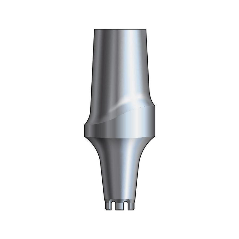 Inclusive Titanium Esthetic Abutments are prefabricated, screw-retained intraoral abutments intended to be connected directly to an endosseous implant for retention of a cemented dental prosthesis. They may be indicated for single- and multiple-tooth restorations. Titanium esthetic abutments are precisely machined from titanium alloy and packaged NON-STERILE. They are attached to the implant fixture with a titanium screw. Unlike the circular emergence profile of standard stock abutments, esthetic abutments are manufactured with a tapered emergence profile for more natural-looking contouring of the soft tissue at the implant site. Each esthetic abutment is specific to the restorative platform of the seated implant, and anatomically designed for the connection site’s region on the ridge (anterior or posterior). In addition to the standard, straight abutment body, angled abutment bodies, produced with a 15 degree slope of one hemisphere to compensate for an undesirable path of insertion resulting from excessive implant angulation, are available.