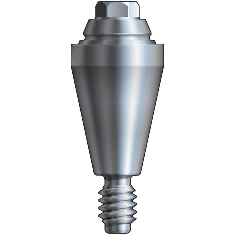 Straight multi-unit abutments lack any anti-rotational features at the implant-abutment interface. The apical portion of a straight multi-unit abutment is threaded for attachment with the internal connection of a seated implant. For abutment delivery, the occlusal surface features a male hex head compatible with the Inclusive Multi-Unit Driver.