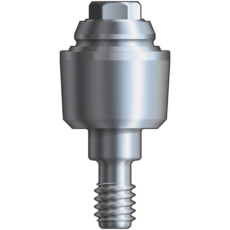 Straight multi-unit abutments lack any anti-rotational features at the implant-abutment interface. The apical portion of a straight multi-unit abutment is threaded for attachment with the internal connection of a seated implant. For abutment delivery, the occlusal surface features a male hex head compatible with the Inclusive Multi-Unit Driver.