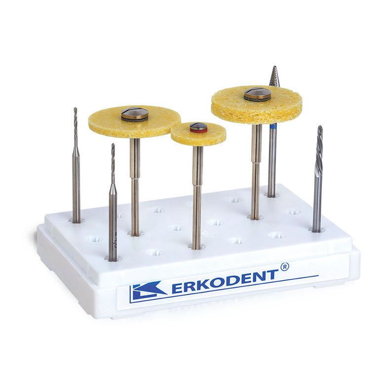 This kit contains all of the rotating instruments that are useful for the finishing of thermoformed appliances. Instruments include: